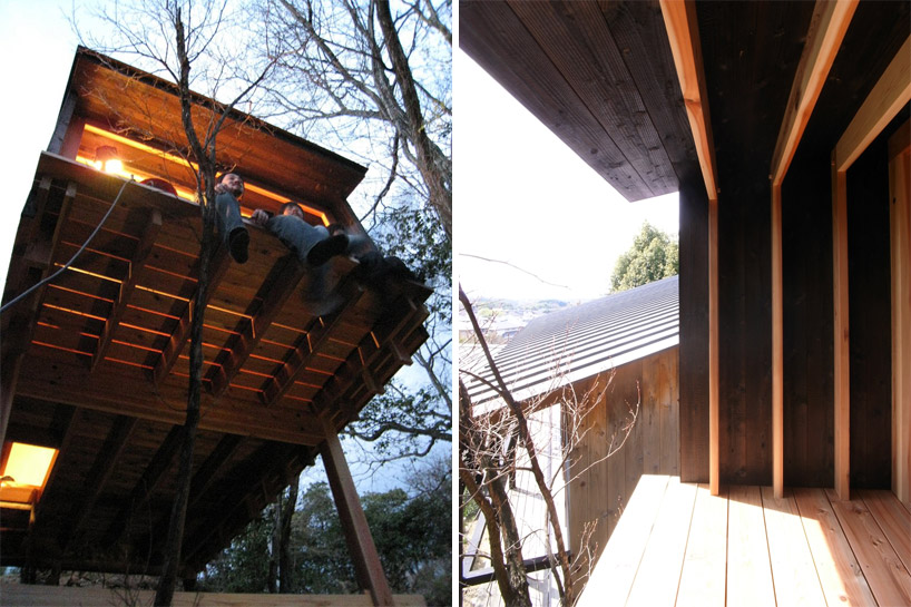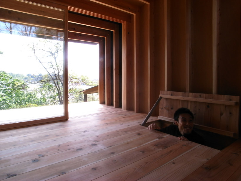 Access is provided by a ladder (like all good lofted structures) that leads you through a small, treehouse-like hatch in the floor. The interior is finished with Japanese cedar, and divided into two main zones. The interior zone is enclosed and the outer is a sheltered, open terrace.