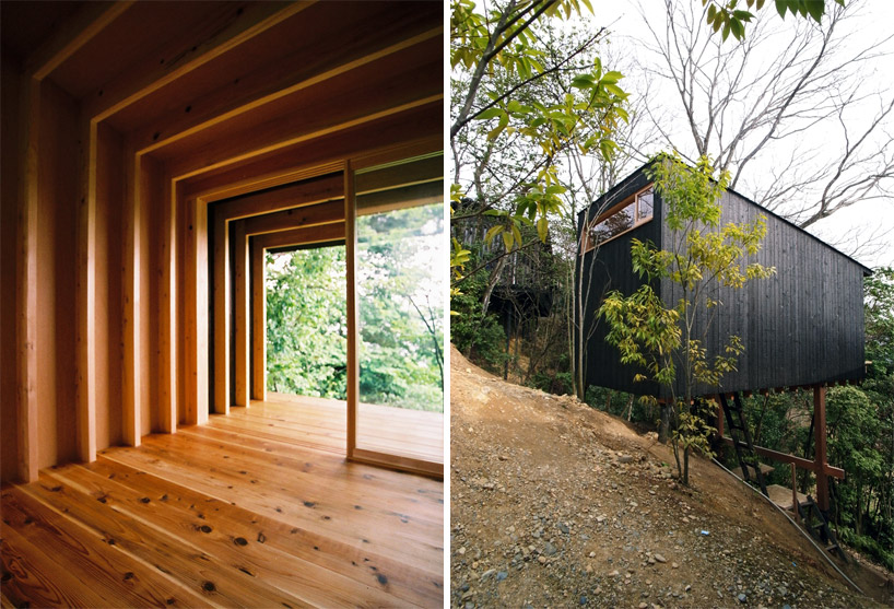 Hut is a small shelter, elevated from the sloping ground of a forest in Nara, Japan. It was built as part of a project that explores traditional Japanese design elements. It features a simple rhythmic structure, composed of timber posts, and beams. The end result is this elegant, and beautifully finished little space that aims to connect the occupant with the surrounding forest.